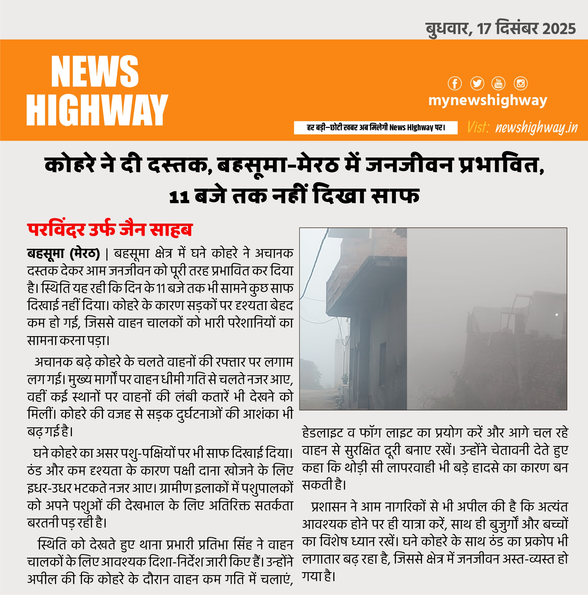 प्रशासन ने आम नागरिकों से भी अपील की है कि अत्यंत आवश्यक होने पर ही यात्रा करें, साथ ही बुजुर्गों और बच्चों का विशेष ध्यान रखें। घने कोहरे के साथ ठंड का प्रकोप भी लगातार बढ़ रहा है, जिससे क्षेत्र में जनजीवन अस्त-व्यस्त हो गया है।
