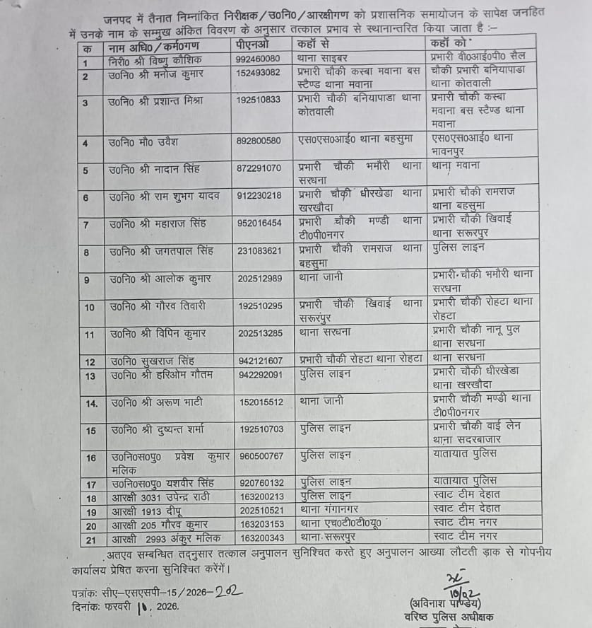 एसएसपी द्वारा किए गए इस फेरबदल में विभिन्न थानों और चौकियों पर तैनात पुलिसकर्मियों को इधर-उधर स्थानांतरित किया गया है। पुलिस लाइन, थाना मवाना, सरधना, बहसूमा, रोहटा, सरूरपुर, जानी, कंकरखेड़ा सहित कई थानों और चौकियों में नई तैनाती की गई है।